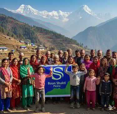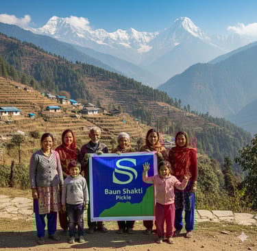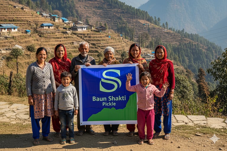 This image isn’t just a photograph — it’s a glimpse into the heart of Baun Shakti. Behind every jar of our pickle stands a community of proud mountain families who pour their skill, heritage, and soul into every batch.